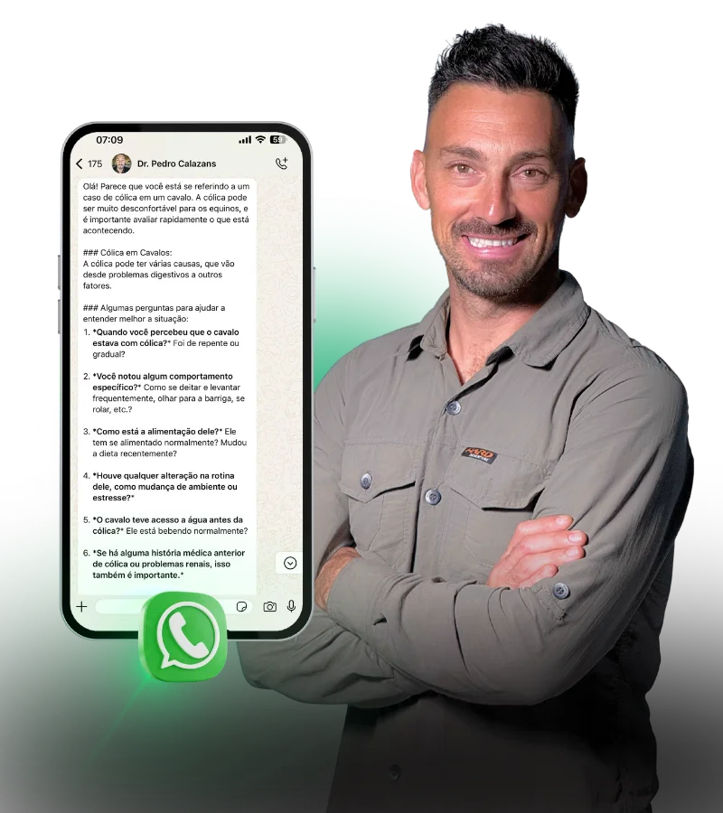 Cavalos, vacas, aves... na roça, depender de atendimento é difícil. Dúvidas sobre tratamento, alimentação? Fale direto com Dr. Pedro no WhatsApp. Economize tempo, dinheiro e cuide melhor do seu rebanho.